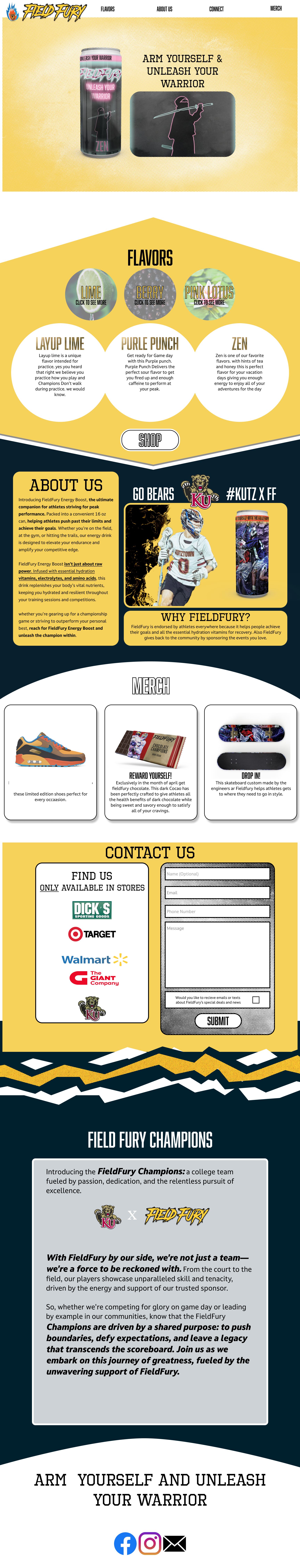 FIELDFURY is an energy drink created for athletes to help them perform at their peak. The website and packaging use elements that convey energy and photos that showcase real athletes competing. The use of textures gives the drink a gritty feeling adding to the energy. The color palette is simple with the use of lights and darks and a vibrant yellow to draw attention and emphasize.